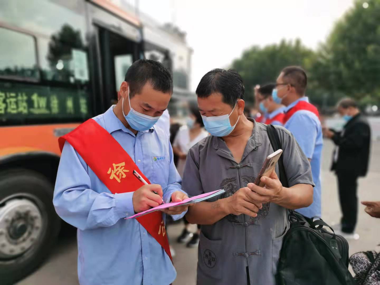 在活動現(xiàn)場,志愿者們積極行動,一邊引導(dǎo)車輛規(guī)范進站,一邊疏導(dǎo)乘客有序上下車,解答乘客提問,并幫助乘客調(diào)取“健康碼”及“行程碼”,方便市民乘車。