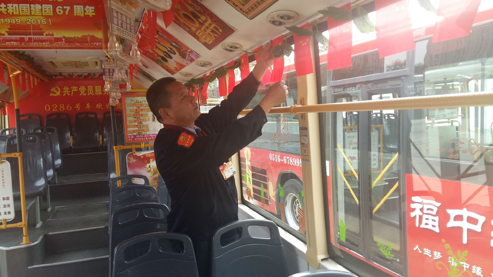公交駕駛工作平凡、枯燥,但曹瑞國愛動腦、喜創(chuàng)新,總會給乘客不一樣的驚喜,感受不一樣的出行服務(wù)。適逢節(jié)日、活動,他總會換著花樣地自掏腰包,給車上乘客一個驚喜:春節(jié),購置小紅燈籠掛滿整個車廂,給乘客帶來濃濃的年味;母親節(jié),他準備了100支康乃馨、祝福卡,送給“媽媽級”女乘客,道上一聲由衷的問候;今年七一,為慶祝建黨95周年,他準備了95面黨旗,95本黨章,以及黨徽、紀念章給乘客,并在車廂廣播入黨宣言、革命紅歌;9月22日宣傳世界無車日,他制作了10個卡通宣傳牌,加班安裝在車廂四周,號召市民選用綠色交通工具出行,減少城市污染;十一,他將一百面國旗掛在車廂內(nèi),被媒體稱為“國旗哥”;10月9日重陽節(jié),為老年乘客發(fā)放免費鞋墊……