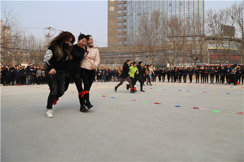 “參賽隊員各就各位!裁判員準備計時!”運動會主持人一聲令下,首先開始比拼的項目是需要隊員齊心協(xié)力,發(fā)揚合作精神的“三人四足接力賽”,三人一組紅繩綁腿齊步走,每隊12名參賽隊員,比的是速度,更是勁兒往一處使的同心合力?!凹佑停〖佑桶?!”“一二!一二!”比賽場上運動員的號子聲和場外女工們的加油聲、歡笑聲交織一起,此起彼伏。