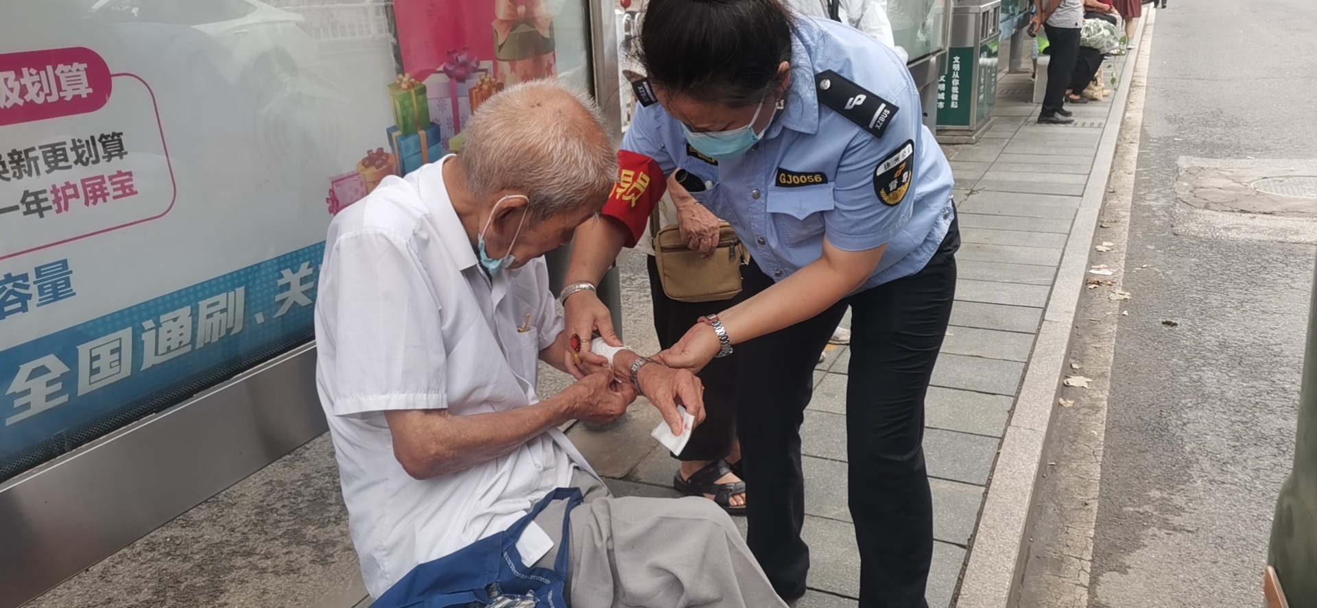 8月2日上午8時許,公交督導員孫琪在朝陽站開展站臺執(zhí)勤工作時,突然聽到有人大喊:“快來救一下,有人摔倒了!”孫琪當即上前查看情況,發(fā)現(xiàn)一位老人癱坐在站臺上,不停地喘著粗氣,胳膊上有一個大傷口,鮮血直流。