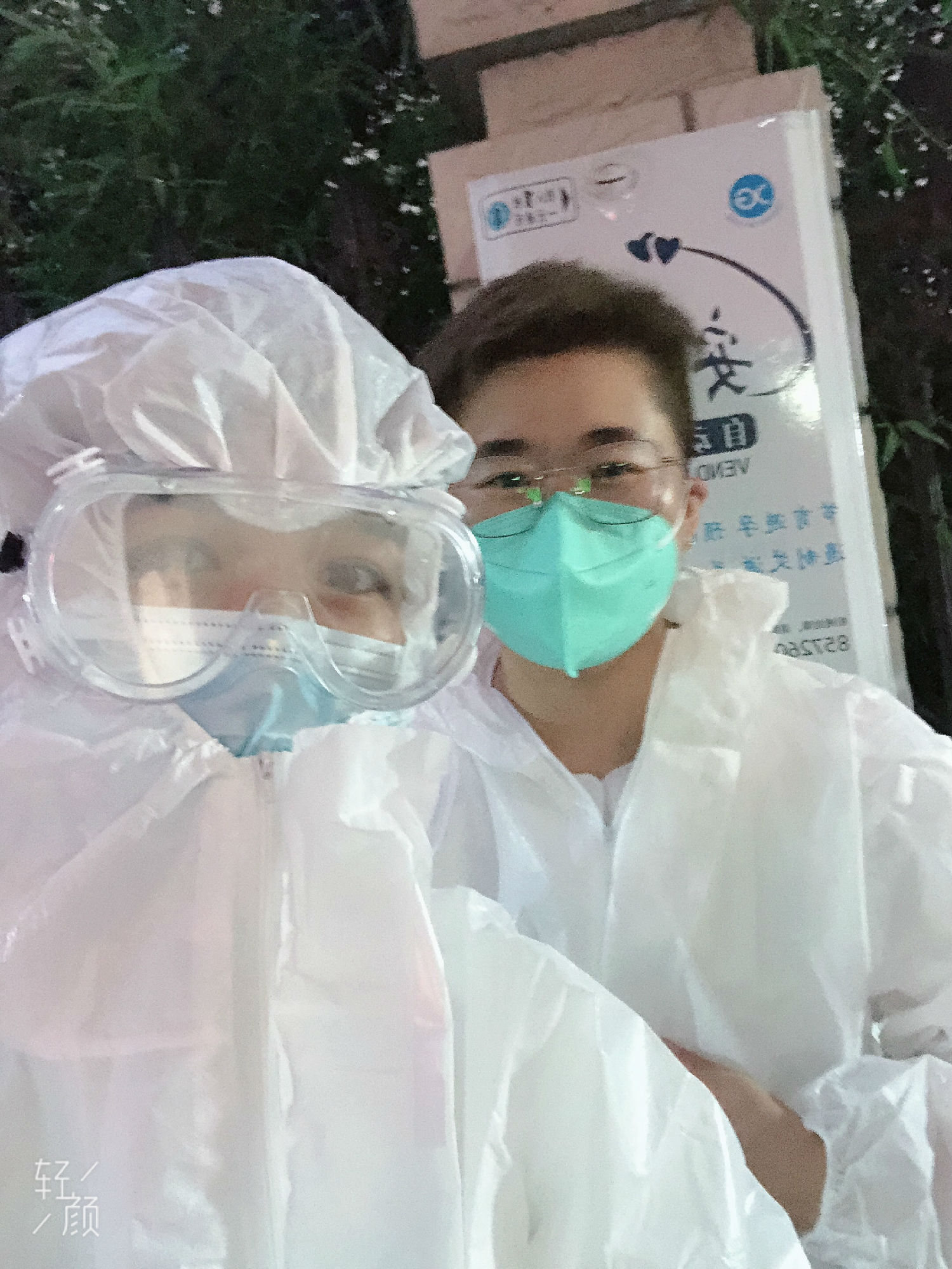 “請大家不要著急,排好隊、戴好口罩,保持一米距離。”身穿防護服的她們高聲引導(dǎo)。短短兩天時間她們親身體驗到了醫(yī)護人員的辛苦。“這是我們倆第一次穿上防護服,和之前電視里看到一樣,脫下防護服后皮膚上有深深的勒痕,但是穿上的那一刻就感到責(zé)任重大!”兩個年輕人“苦中作樂”用照片記錄下自己這段特殊的經(jīng)歷。