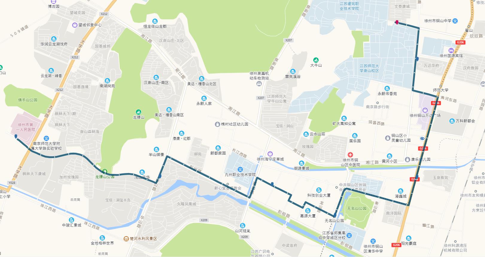 線路站點(diǎn):建筑學(xué)院、江蘇師范大學(xué)、師范大學(xué)地鐵站、萬(wàn)科新都會(huì)、港鑫城、南洋國(guó)際、康樂(lè)園南門(mén)、無(wú)名山公園地鐵站、銅山區(qū)政府、楚河金茂府、嵩山路、銅山新區(qū)總站、久隆鳳凰城北門(mén)、保利迎賓館、龍腰山公園、泉山森林海、第一人民醫(yī)院南門(mén)。