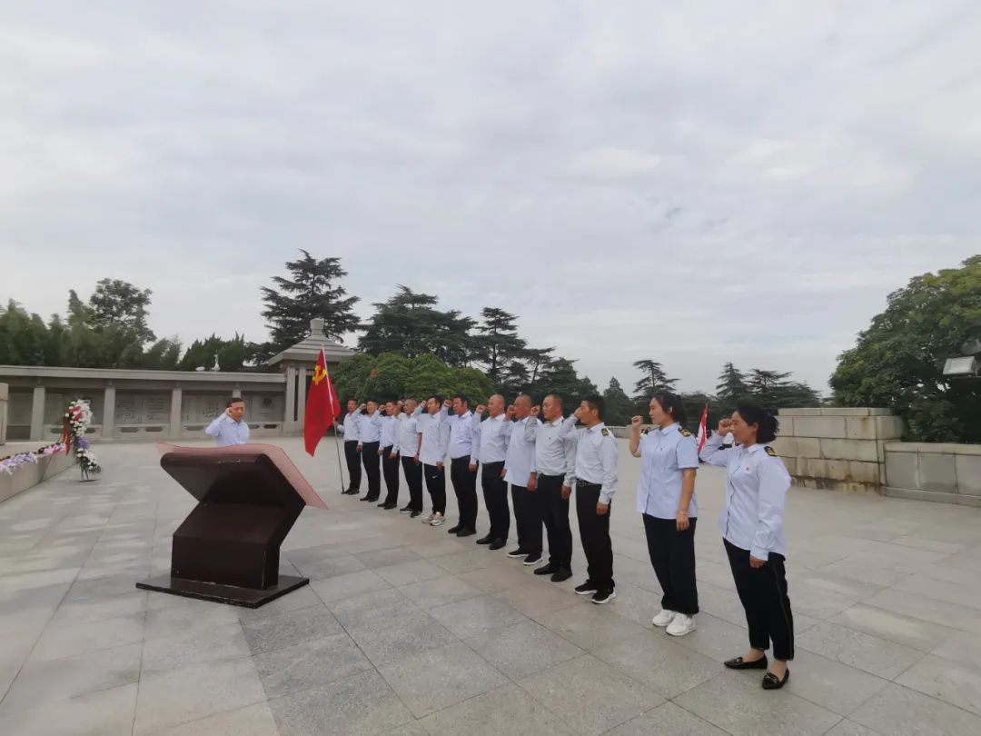 淮海戰(zhàn)役烈士紀(jì)念塔坐落在徐州市市南郊鳳凰山東麓,面向朝陽(yáng),巍然聳立。黨員們懷著無(wú)比崇敬的心情,在烈士紀(jì)念塔前整齊列隊(duì),神情肅穆,向烈士默哀致敬!