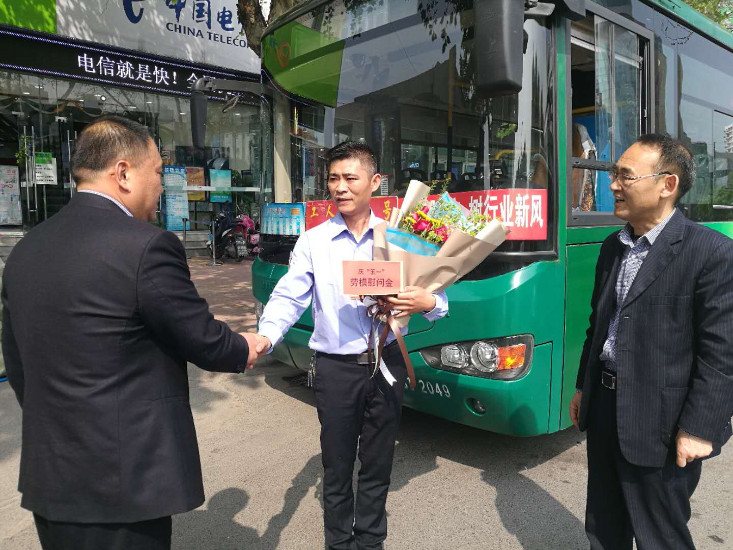 杜紅軍一行首先來到韓山終點(diǎn)站,剛行駛完一趟的市勞模、49路線駕駛員王博正利用休停時(shí)間打掃車輛,杜總走上前親切地與王博握手,并把一束嬌艷芬芳的鮮花和勞模慰問金送到他手中。