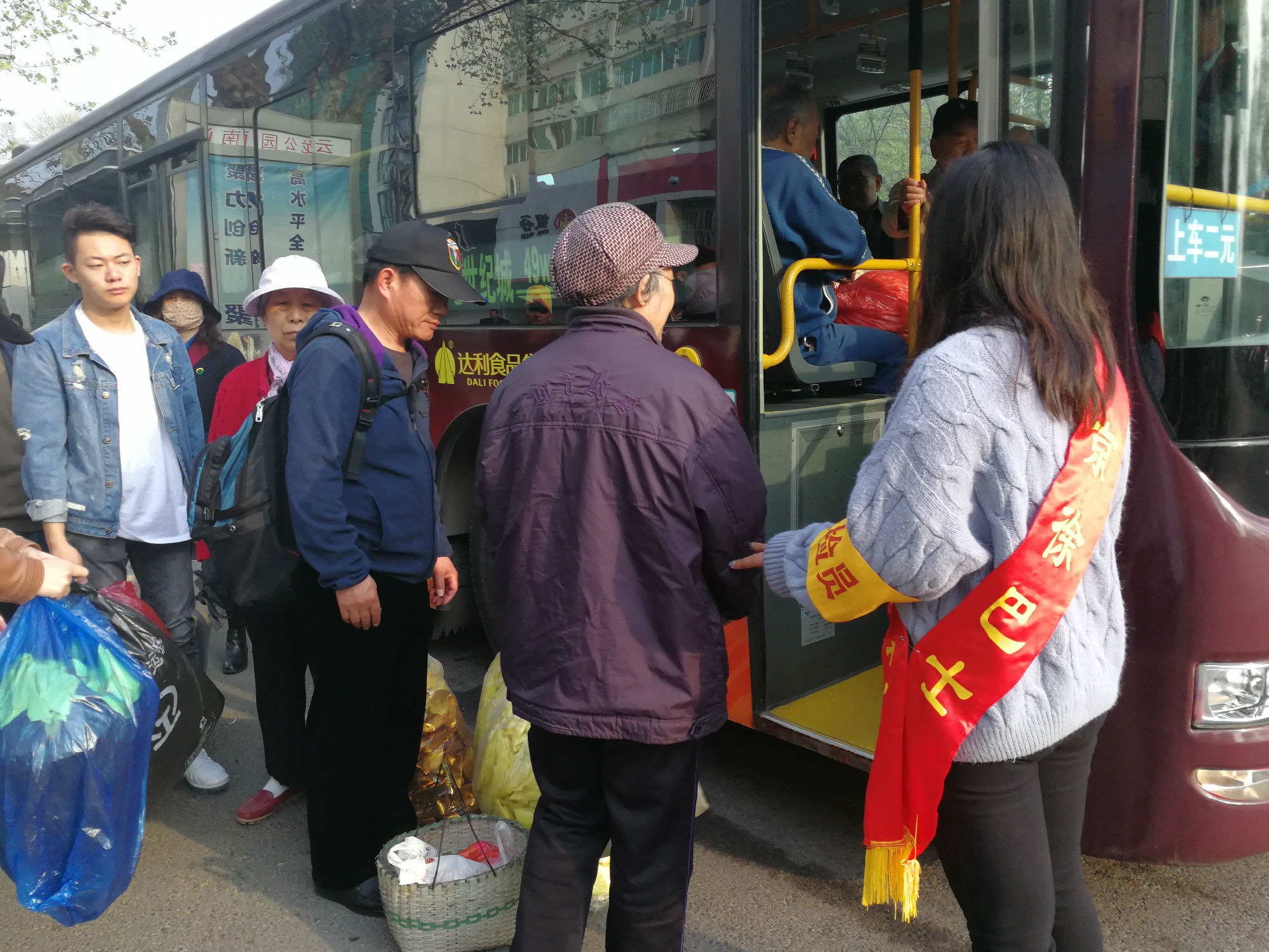 云龍公園南門(mén),站滿(mǎn)了拿著大包小包的乘客。“大家排好隊(duì),注意安全,不要擁擠,需要換零錢(qián)的乘客可以到零幣兌換處換取零錢(qián)?!敝驹刚呶⑿χS持現(xiàn)場(chǎng)秩序。人群中有位提著兩個(gè)大包裹的大媽?zhuān)驹刚咦叩酱髬尭?,關(guān)切地詢(xún)問(wèn):“大媽?zhuān)襾?lái)幫您把包裹拿上車(chē)吧。”志愿者一手?jǐn)v扶老人上車(chē),一手拿著物品,為其安排好座位并叮囑大媽注意安全。一班車(chē)走后,還沒(méi)撈著喝口水,現(xiàn)場(chǎng)又聚滿(mǎn)了乘客,志愿者們又開(kāi)始忙碌起來(lái):“大爺,車(chē)還要一會(huì)才能來(lái),您先坐這歇一會(huì)吧?!敝驹刚吣脕?lái)板凳,讓老大爺坐下休息,老大爺十感動(dòng),說(shuō)道:“你們真貼心。
